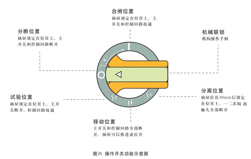 抽屜插入后,將手柄順時(shí)針方向轉(zhuǎn)動(dòng)時(shí),首先到達(dá)“試驗(yàn)位置”(↓),此時(shí)機(jī)構(gòu)將外部電源引入控制回路,用戶通過面板上的安全電器(假如有的話)對電路進(jìn)行試操作,以確認(rèn)其是否符合要求,由于主開關(guān)尚處于斷開狀態(tài),因此一次回路處于無電狀態(tài),即使操作結(jié)果與要求不符也不會(huì)損壞設(shè)備,繼續(xù)順時(shí)針方向轉(zhuǎn)動(dòng)到手柄處于水平位置時(shí),即“分?jǐn)辔恢?rdquo;(0)。此時(shí)一次和二次回路均處于無電狀態(tài),沿順時(shí)針方向繼續(xù)旋轉(zhuǎn)90°則手柄轉(zhuǎn)到“合閘位置”(I),見圖六。