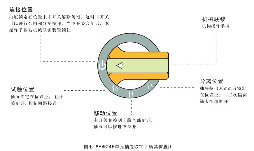 8E, 16〔和24E抽屜的操作:這種操作稍不同于8E14和8E/2單元抽屜的操作,由輪番操作一大一小二個(gè)手柄來完成。小手柄與8E/4,8E/2抽屜的操作手柄外形相同,作機(jī)械聯(lián)鎖用,位于抽屜面板右下方,它共有四個(gè)位置:“移動(dòng)位置”(↑↓)、“分離位置”(↑↓)、“試驗(yàn)位置”(↑↓)和“連接位置”(↓),見圖七、圖八。
