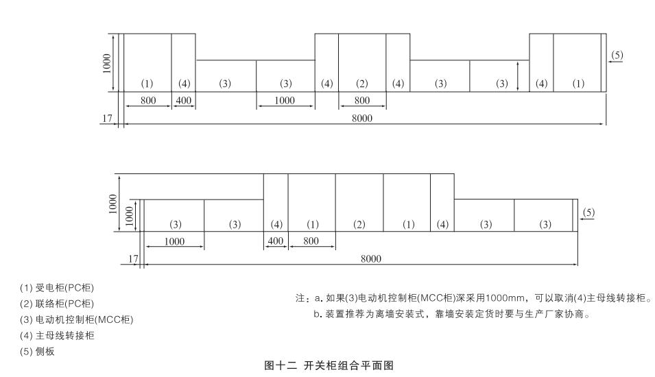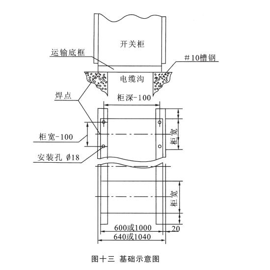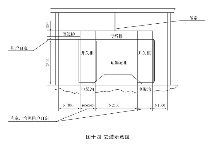 安裝:開關(guān)柜就位。找準(zhǔn)位置,按圖十一所示進(jìn)行焊接,焊接節(jié)柜和焊長由用戶確定,產(chǎn)品安裝與配電室的相對位置參考圖十二,其中吊索是否安裝由用戶確定,制造商提供的原則是:當(dāng)母線橋的長度大于3米時(shí)應(yīng)考慮安裝吊索。但是,當(dāng)母線橋的電流大于或等于2500A時(shí),其長度為2.5米時(shí)也應(yīng)安裝吊索。